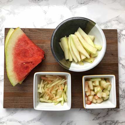 Öntet elkészítése: 1 dl vízbe tegyük bele a juharszirupot, az almaecetet és az olajat. Keverjük össze az apróra vágott görögdinnye héjával. Ha még szükséges, akkor sózzunk utána.