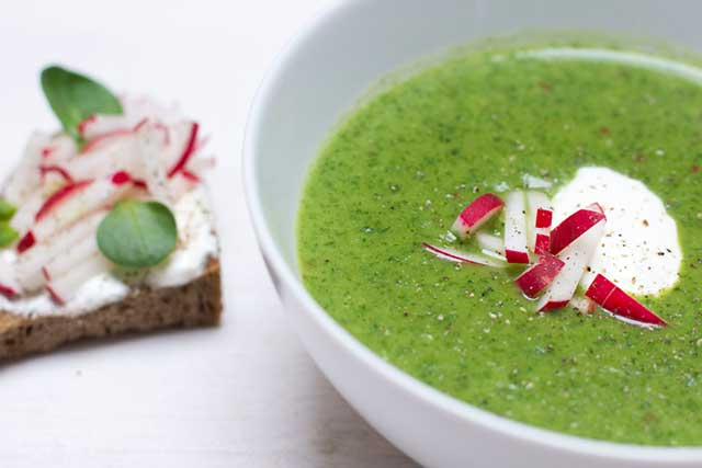 A zöldeket szódabikarbónás vízben mossuk meg, majd tiszta folyó vízben is. Egy lábasba a kókuszzsírt vagy olajat melegítsük fel. Tegyük bele a lisztet és a pirospaprikát, vigyázva keverjük, hogy le ne égjen. Adjuk hozzá a zöldeket és öntsük fel annyi vízzel, hogy ellepje. Forraljuk fel, majd lassú tűznél főzzük 25 percig. A tűzhelyről vegyük le, és botmixer segítségével keverjük simára, borsozzuk. A dióbelet vágjuk apró darabokra és forró teflon serpenyőbe pirítsuk meg egy kicsit. A tányéron lévő levest a pirított dióbéllel és a reszelt parmezán sajttal szórjuk meg. Ízesítsük kurkumával.