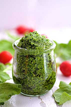A zöldet mossuk meg szódabikarbónás vízben, majd folyó vízben is. Vágjuk apróra és tegyük egy turmixgépbe. Adjuk hozzá az olajat, a fokhagymát és a sajtot. A fenyőmagot kicsit pirítsuk meg egy teflon serpenyőben. Ha kihűlt, a megpirított magokat is tegyük a turmixgépbe. A turmixolás után sózzuk, borsozzuk ízlés szerint.