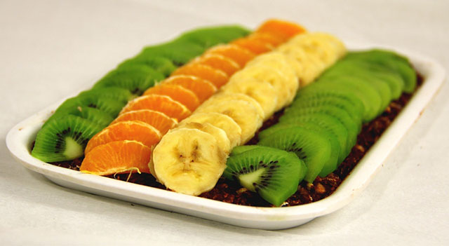 Az alaphoz a diót vagy a mandulát áztassuk be kb. 10 órára. Majd az aprítógép segítségével a többi hozzávalóval aprítsuk morzsás állagúra. Ezt a morzsás állagú alapot nyomkodjuk bele egy tálca aljába. Karikázzuk fel a gyümölcsöket és tegyük az alapra szép sorban.