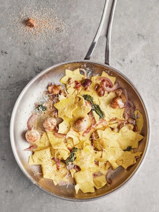 Forraljuk fel a vízforralót. A lasagne lapokat sütivágóval vagy éles késsel vágjuk fel vidám ünnepi formákra, a maradékot pedig tépkedjük szét. A kolbászhúst nyomkodd ki a bőréből kis golyókká. Szeleteld fel finomra a szalonnát. Hámozd meg és szeleteld finomra a hagymát. Szedd le a zsályaleveleket. Reszeld finomra a parmezánt. Egy 28 cm-es serpenyőt magas hőfokon melegíts elő.
