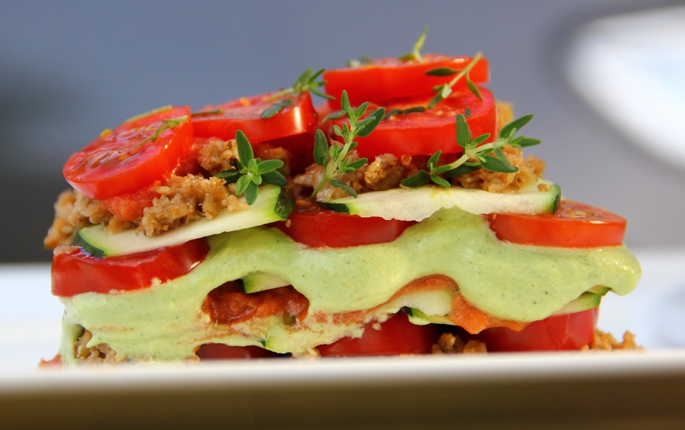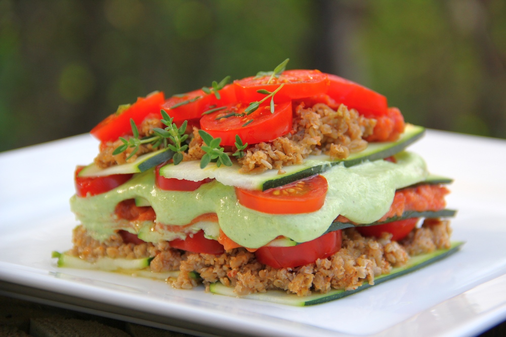 Lasagna a klasszikus recept, ahol a tésztát cukkini csíkok adják, a húsos réteg dióból, a sajtos mandulából, a paradicsomos pedig friss és aszalt paradicsomból készül.
