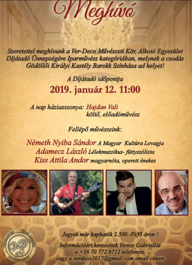 2019. jan.12-én a mesés Gödöllői Királyi Kastély Barokk Színházában invitálom a művészetet kedvelőket, ahol a Ver- Deco Művészeti Kör, Alkotó Egyesület Díjátadó Gálája lesz iparművészeti kategóriában, melynek megálmodója és szervezője az Egyesület elnöke, Veress Gabriella textilszobrász. Érdemes minél előbb gondoskodni a belépőről, a nagy érdeklődésre való tekintettel, hiszen egy varázslatos helyszínen szebbnél szebb alkotásokat tekinthetnek meg a kedves odalátogatók, valamint színes, tartalmas programok gazdagítják és teszik még emlékezetesebbé ezt a különleges rendezvényt a jelenlévők számára.