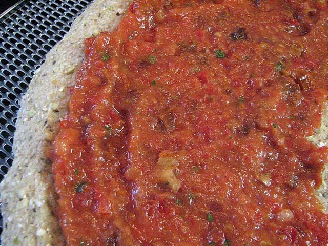 A hozzávalókat turmixoljuk össze. Kenjük a szósz felét a megszáradt pizzalapra, majd 1-2 órára tegyük vissza az aszalógépbe. Tálalás előtt tegyük a pizzára a szósz másik felét, és szórjuk meg apróra vágott zöldségekkel (pritamin paprika, cukkini, retek, petrezselyem, csírák, olaj bogyó stb.)
