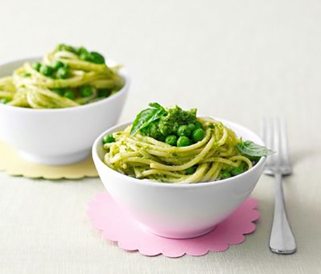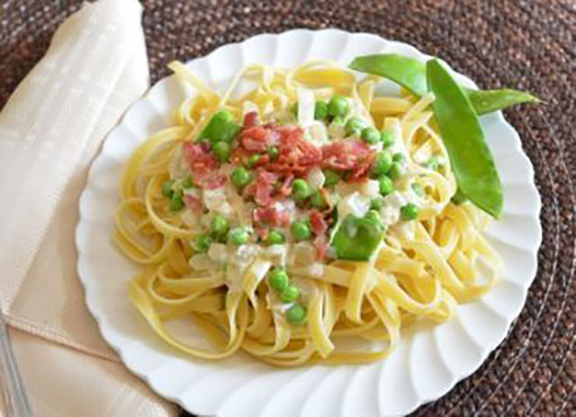 A tésztát főzzük meg forrásban lévő sós vízben. Habverő segítségével keverjük össze a tojást és a tejszínt, majd sózzuk és borsozzuk ízlés szerint. A szalonnát vágjuk vékony csíkokra és egy serpenyőben süssük ropogósra. Ha a tészta félig megfőtt, akkor adjuk hozzá a zöldborsót is és főzzük meg együtt a tésztával. Ha megfőtt a tészta és a borsó is, akkor szűrjük le. Keverjük hozzá a szalonnát és az apróra vágott menta felét, majd a tejszínes-tojásos öntetet is keverjük hozzá. Ha még szükséges, akkor sózzuk és borsozzuk. Tálaláskor szórjuk meg a reszelt parmezánnal és az apróra vágott mentalevéllel.