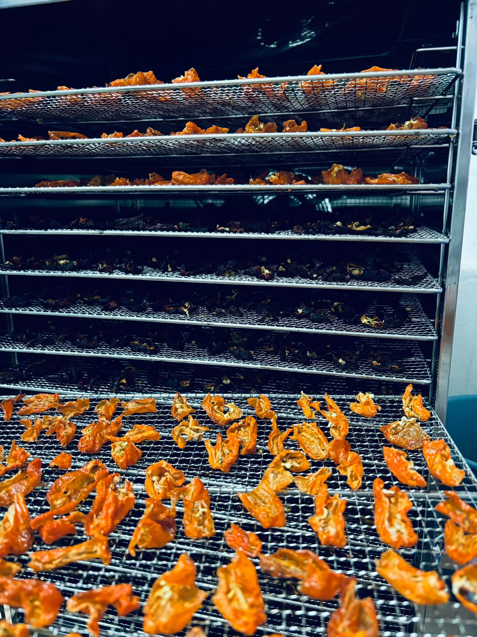 A fagyasztáshoz hasonlóan itt is a „fürcsi” után a minőségellenőrzéssel kezdünk – annyi különbséggel, hogy itt a magokat is eltávolítjuk. Vásároltam erre a célra egy nagyobb aszalót, amelyben már igazán nagy mennyiséget tudok szárítani. Alacsony hőfokon, „kopogósra” szárítom a chilit, majd fajtánként vákuumozom.