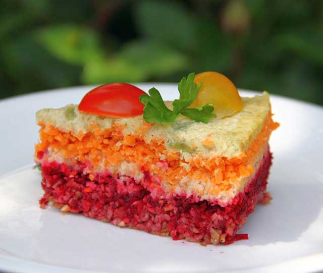 Béleljünk ki egy 18 cm-es tortaformát sütőpapírral. Az aljába nyomkodjuk bele a napraforgómagos alapot, majd a céklás masszát, és utána a sárgarépás massza felét. Tegyük rá a sajtréteg felét, majd a sárgarépás massza másik felét is. A tetejét zárjuk sajtréteggel. Ügyeljünk arra, hogy minden réteget alaposan nyomkodjunk le. Helyezzük a hűtőszekrénybe egy órára.